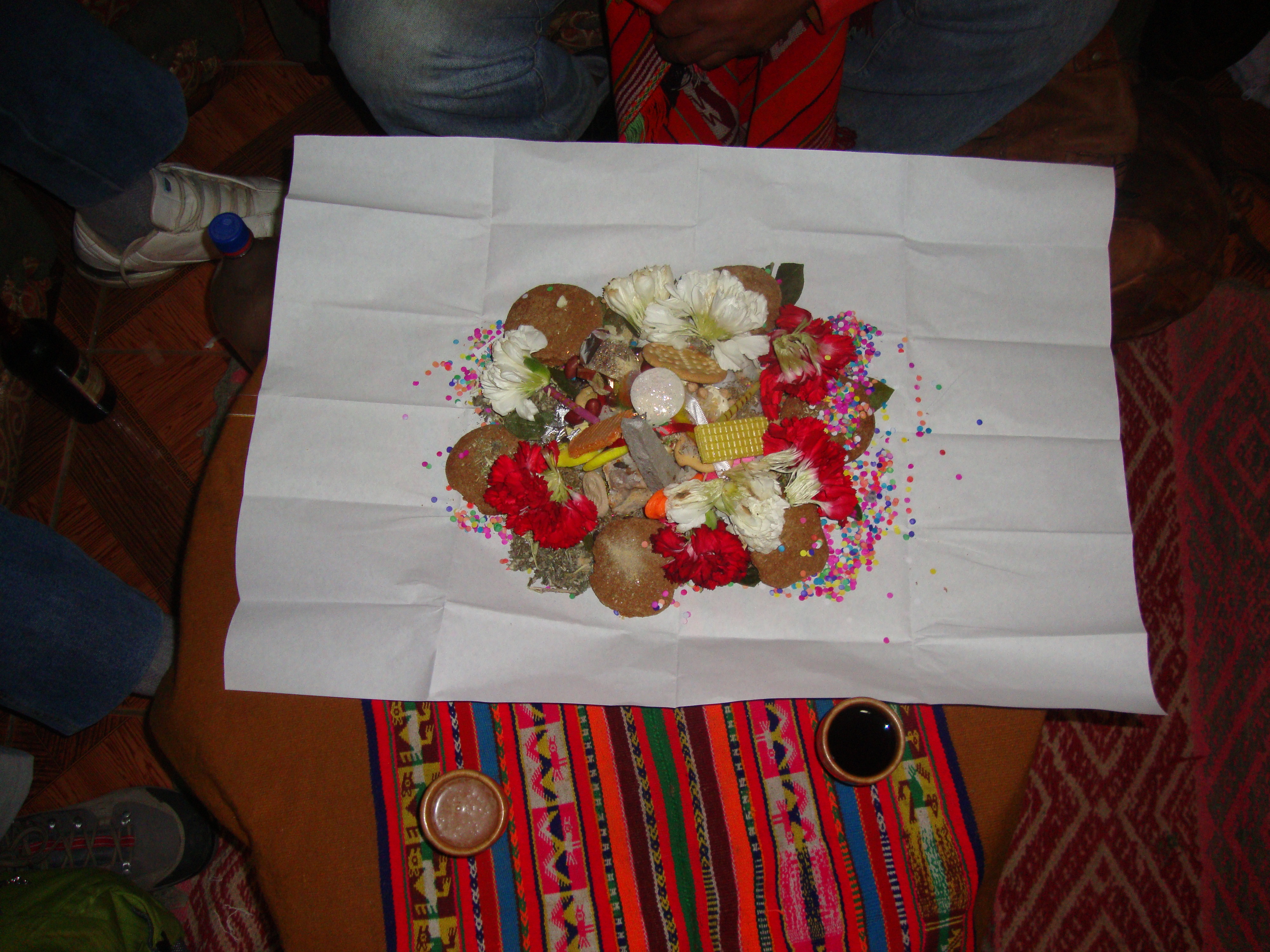 A bag of coca leaves was passed. [It should be noted that the coca leaf is part of nearly everything in Peru. It is used to make tea to cure all kinds maladies including altitude sickness, headaches and bellyaches, to aid in digestion. The locals chew it like gum, and it is also part of sacred ceremony.] Each of us was instructed to find four perfect leaves – ones that were whole, dark green, with strong spines. Then a bag was passed with tiny waxed paper packets, each containing symbolic ingredients. We each selected a packet.