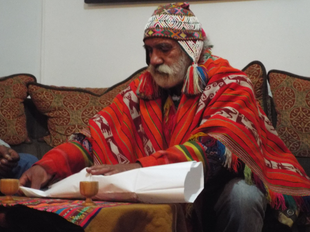 The despacho is performed by a shaman. Our shaman was named Vidal (a name which made me immediately think ‘Sassoon!’) and he was dressed in a vibrant red poncho over faded jeans, and wore a multi-colored woven hat with beads and tassels. He had a mostly-white beard, a resonant voice, and a chiseled face of importance – but one with a smirk. It was hard not to be amused by his get up and demeanor. Please pardon how disrespectful that sounds, but he was a character in the best sense of the word. He sat on a couch before us with another man who appeared to be his assistant.